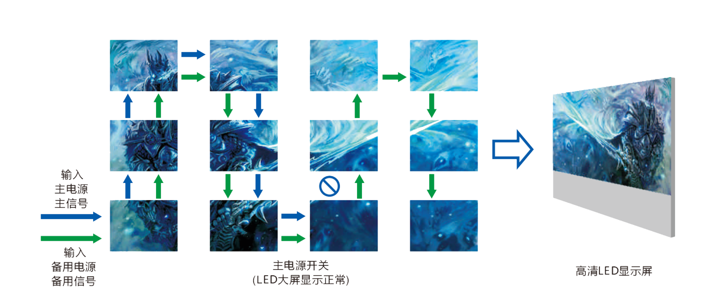 發(fā)生故障的時(shí)候,另一路信號(hào)自動(dòng)介入,保證顯示屏正常工作。
