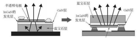 相對(duì)于正裝COB封裝,倒裝COB結(jié)構(gòu)更加簡(jiǎn)單 LED耐更高電流,制造工藝簡(jiǎn)化 無金線 散熱更佳,穩(wěn)定性高,且RGB混光效果好。